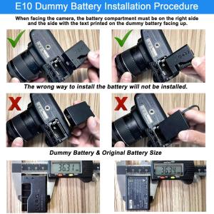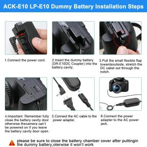 [Package List:] 1* LP-E10 Dummy Battery / DR-E10 DC Coupler, 1*ACK-E10 Continuous Power Adapter, 1* US Plug Power Cord.