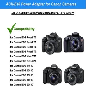 [Compatible with:] This lp-e10 dummy battery dr-e10 dc coupler and ack-e10 / CA-PS700 continuous power adapter kit, fit for Canon EOS Rebel T7 T3 T5 T6, Kiss X50 X70 X80 X90, EOS 1100D 1200D 1300D 1500D 2000D cameras.